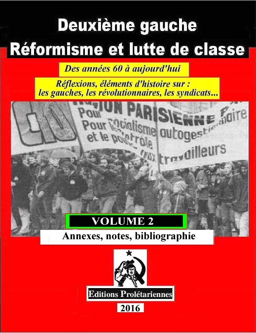-les origines et la tactique des différents courants se réclamant de la révolution ; -l'évolution du PCF, de la CGT, de la CFDT ; -le rôle de la référence à l'autogestion mis en avant par la CFDT et le PSU ; -la stratégie opportuniste de l'union de la gauche ; -l'histoire du mouvement marxiste-léniniste et ses rapports avec les syndicats et la gauche ; -l'évolution du courant de l'écologie politique ; -le passage d'une fraction de la petite bourgeoisie, du gauchisme en rupture avec le marxisme vers un courant idéologique proche de l'extrême droite ; -la nature et l'histoire de la " deuxième gauche " (principalement PSU, CFDT) ; -le rôle de Michel Rocard, Jacques Delors, Edmond Maire, Jacques Chérèque… Sources, chronologie, contexte… Les sources nombreuses de cet ouvrage, couvrent plusieurs décennies. Une chronologie de 1968 à 1986, rend compte et rappelle le contexte de l'époque. A la fois, historique et politique, cet ouvrage construit scientifiquement, n'en est pas moins engagé. Son auteur et son préfacier ont été et sont des militants politiques, syndicaux et associatifs depuis plusieurs années. Avec ses 18 chapitres en 8 parties, ses 144 annexes, une bibliographie de 180 livres et de plus d'une centaine de journaux, brochures, revues… ainsi que des centaines de références et de titres d'articles, l'ouvrage très documenté, indiquant de très nombreux liens internet, pourra servir de base à une analyse critique du phénomène de la " deuxième gauche ", de sa nature réformiste profonde, et montrer toute l'actualité et la nécessité du combat contre son influence. L'ouvrage en version papier est disponible en 2 volumes. Le premier regroupe la préface, les 18 chapitres, la conclusion, l'index des sigles, la table des matières. Le deuxième regroupe les 144 annexes, les 10 notes, l'index des sigles, la bibliographie.