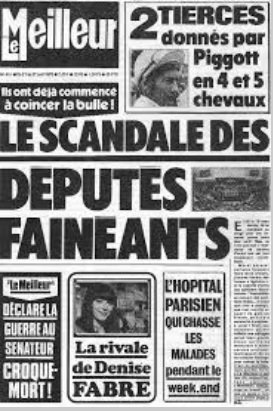 LE MEILLEUR Fondé le 5 mars 1971 par Alain Ayache, et édité par la S.A.R.L. les Meilleures Éditions (capital 100 000 F), Le Meilleur paraît le vendredi sur 24 pages avec un encart de 8 pages consacré au tiercé. Conséquence de la présence à sa tête, en la personne de son directeur-fondateur, du créateur et premier rédacteur en chef de Spécial dernière, qui devait par la suite imiter assez largement Le Meilleur, les deux hebdomadaires du tiercé entretiennent plus d'une ressemblance. Format tabloïd, mise en page et choix des sujets les rapprochent en effet. Le Meilleur affirmera sa spécificité en s'ouvrant aux faits divers, puis, contrairement à sa profession de foi originelle, mais pendant un temps seulement, au sexe. Politiquement, Le Meilleur paraît refléter une sensibilité « poujadiste ». Il s'en prend autant aux administrations qu'à tout ce qui, comportements ou propos, paraît menacer le conformisme ambiant. L'hebdomadaire, qui refuse la qualification de « presse à sensation », se donne volontiers pour un « journal social qui prend parti », ou un exemple de cette « presseguérilla » qui, sans précaution excessive, livre au public l'information que les confrères aseptiseraient. Après avoir, par exemple, accusé la caisse d'épargne l'Écureuil de voler vingt-trois millions de Français, l'hebdomadaire est poursuivi par M. Fourcade, ministre des Finances, pour atteinte au crédit de la Nation. (Extraits du livre La presse périodique en France -Michel Jamet- chez Armand Colin- janvier 1983 |