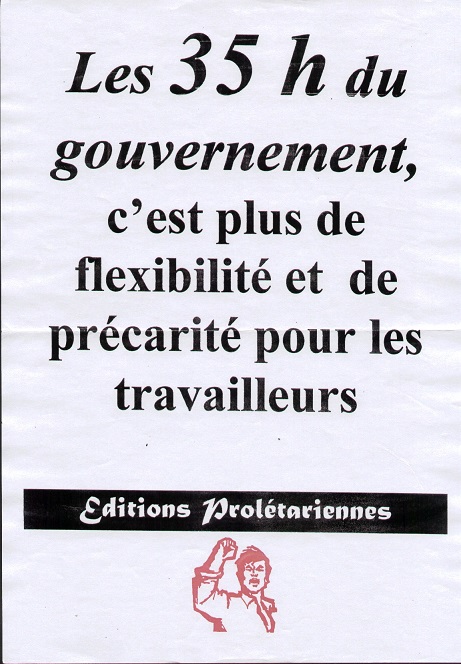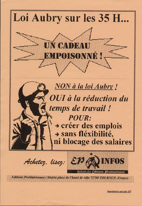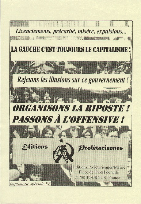 Ces affiches des Editions Prolétariennes, correspoondent principalement à des moments et des campagnes politiques précises : contre la guerre en Yougoslavie, pour la réduction du temps de travail et contre la loi Aubry, contre le racisme et le fascisme, pour la solidarité internationale... Les adresses postales indiquées sur celles-ci ne sont plus valides. La seule adresse email valide reste : edi.prol@yahoo.fr |