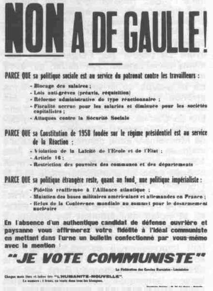 1968. ..... Comme nous l'avons vu, le Congrès de Lancry avait créé le M.C.F. (ml) en le considérant comme un organisme transitoire entre la " Fédération des Cercles marxistes-léninistes " et le PARTI proprement dit. Aussi, l'HUMANITE-NOUVELLE publia-t-elle le 11 mai 1967 un éditorial de François MARTY, sous le titre " En avant vers la constitution prochaine du Parti communiste de France " et qui commençait par cette phrase explicite : ..... ..... " Conformément à l'article 19 des Statuts du Mouvement communiste français (marxiste-léniniste), notre Comité central a décidé à l'unanimité, au cours de sa session des 22 et 23 avril à Paris, de convoquer avant la fin de l'année le Congrès constitutif du Parti communiste authentiquement révolutionnaire pour remplacer le P.C.F. qui n'a plus de communiste que le nom. " ..... Aussitôt commença une nouvelle lutte acharnée POUR OU CONTRE LA CREATION DU NOUVEAU PARTI MARXISTE-LENINISTE tant à l'intérieur des rangs du Mouvement communiste français qu'à l'extérieur de ses rangs. ..... A l'intérieur du M.C.F. (ml) la ligne hostile à la création du Parti se manifeste sous plusieurs formes. Dans le Comité central, un seul militant s'y oppose sans être vraiment capable de donner à son attitude un contenu explicite. II engagea bientôt une intense activité fractionnelle sur le plan de la région qu'il suivait, celle de LYON, et, non sans que des efforts prolongés ne soient accomplis pour le rattraper par la persuasion et la conviction, il fut finalement purement et simplement exclu. ..... Mais en dehors du Comité central, la ligne petite-bourgeoise commença à se développer activement parmi les anciens militants du groupe " Drapeau rouge ", à PARIS exclusivement. Ce groupe, composé d'éléments étudiants, était celui qui, dans l'U.E.C. révisionniste, avait engagé la lutte ouverte puis appelé à rompre organisationnellement pour rejoindre le M.C.F. (ml). La plupart de ses militants étaient issus des Jeunesses du P.S.U., avant de passer par l'organisation étudiante révisionniste. Son leader, qui avait mené une activité efficace à la fois contre le groupe de Krivine, contre la ligne erronée du cercle d'Ulm et contre les dirigeants révisionnistes, était aussi membre du Comité central du M.C.F. (ml) depuis le Congrès de Lancry. Il s'écarta du Mouvement sans donner d'explications vraiment précises et, de suite après l'été 1967, la plupart des militants qu'il avait amenés avec lui abandonnèrent le M.C.F. (ml) soit d'eux-mêmes, soit qu'ils aient été exclus par suite d'une activité fractionnelle ouverte qui ne pouvait être admise et violait délibérément les Statuts. II s'agissait exclusivement d'étudiante et d'enseignants, que l'activisme de l'U.J.C. (ml) impressionnait et qui, de ce fait, adoptaient des positions hésitantes sur la question de la création du Parti. Les violences physiques des révisionnistes n'étaient pas non plus sans influence sur leur comportement. Enfin une autre tentative, décidée fractionnellement, prit pour appui la cellule d'AIX en Provence, un membre du Bureau politique, vieux militant du Parti révisionniste rallié dès l'époque de la Fédération, y jouant un rôle particulièrement fourbe. Agissant avec duplicité, ce dirigeant cacha sa position devant les organismes dirigeants et prépara une tentative de putsch à réaliser pendant la tenue du Congrès constitutif du Parti. Mais, comme il ne put mener à bien son projet visant essentiellement à arracher la direction du jeune Parti aux militants qui devaient l'assumer, il fut ensuite violemment pris à partie par les jeunes adhérents de la cellule d'AIX en Provence, tous étudiants dont la moitié démissionnèrent non sans l'avoir démasqué ! Le cahier où se trouvaient enregistrées les discussions et décisions de cette cellule permit de découvrir le double jeu qu'avait joué ce faux marxiste-léniniste, qui fut écarté peu après l'interdiction du P.C.M.L.F., en juin 1968, sans que puisse être établi de manière certaine s'il s'agissait d'un flic, d'un agent révisionniste ou simplement d'un aventurier. ![]() Alors que les marxistes-léninistes lançaient le juste mot d'ordre (sur l'affiche ci-dessus), le C.M.L.F. propageait l'idée que les marxistes-léninistes appelaient à voter de Gaulle, ce que les révisionnistes ne manquèrent pas d'utiliser. ..... De l'extérieur